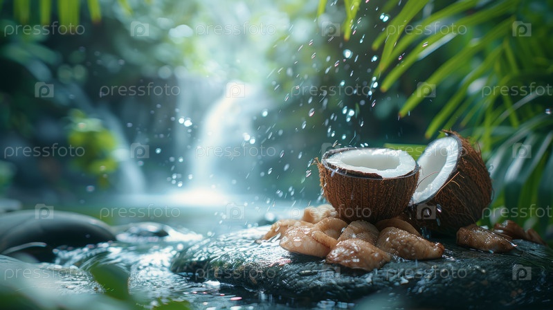 Погрузитесь в успокаивающее спокойствие природы, наслаждаясь свежими кокосами рядом с потрясающим водопадом