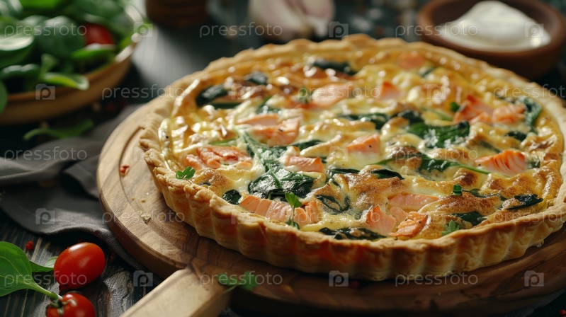 quiche со шпинатом и лососем и соусом bechamel на деревянной тарелке со свежими листьями