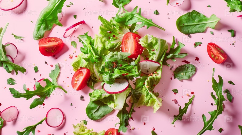 Красочный салат с аругулой, помидорами и редисами на розовом фоне, яркое сочетание свежих, полезных ингредиентов