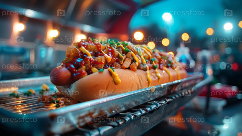 Закрытие вкусного хот-дога с начинками на вечернем спортивном мероприятии, идеально подходящее для питания и образа жизни