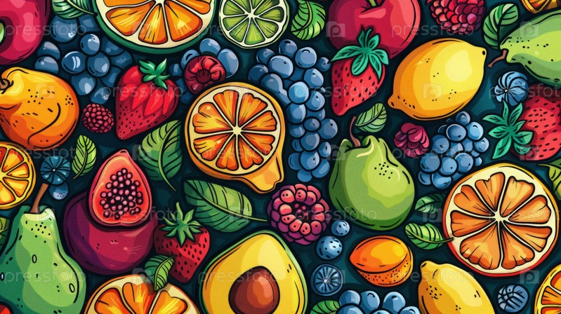 Красочная, подробная иллюстрация разнообразных фруктов на темном фоне свежая, сочная и здоровая
