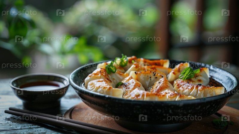 Красиво устроенная тарелка хрустящих пельменей в сопровождении свежих трав и вкусно острый погруженный соус