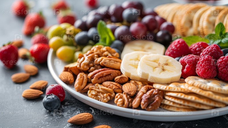 Яркий и красочный ассортимент свежих фруктов, орехов и хрустящих крекеров для восхитительной презентации закусок