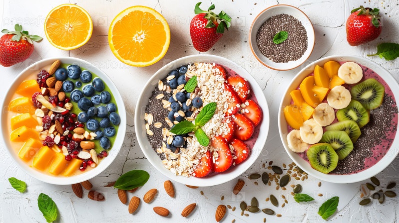 Эта чаша смузи увенчана свежей клубникой, бананами и хрустящими орехами для здорового лечения