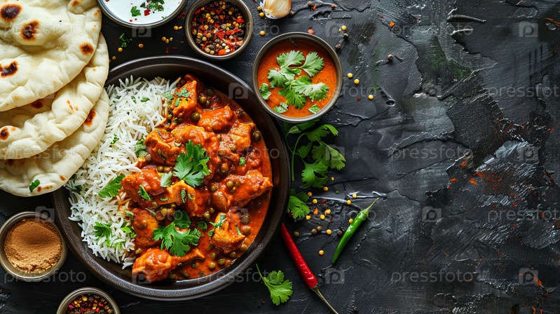 Куриная тикка масала пряная мясная пища карри с рисом и хлебом наан