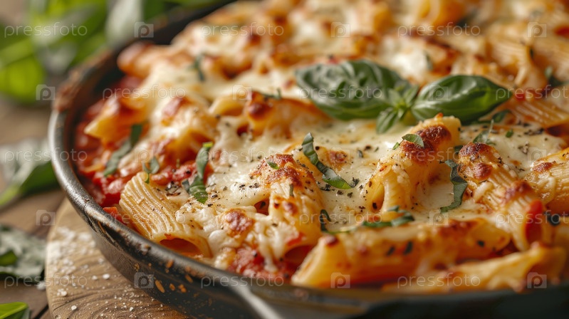 Савори испекла макароны с пенни, щедро покрытые расплавленным сыром и украшенные свежим, ярким базиликом