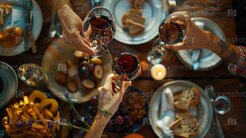 На солнечном собрании друзья звенят бокалами вина, празднуя вкусной едой и восхитительной компанией