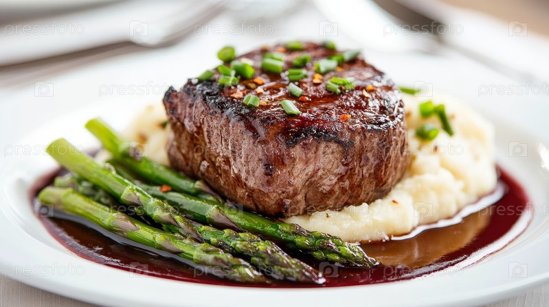 Гурманное блюдо из филе миньона, нежной спаржи и сливочного картофельного пюре представлено изысканно