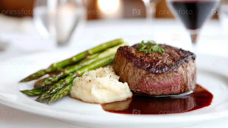 Гурманное блюдо из филе миньона, нежной спаржи и сливочного картофельного пюре представлено изысканно