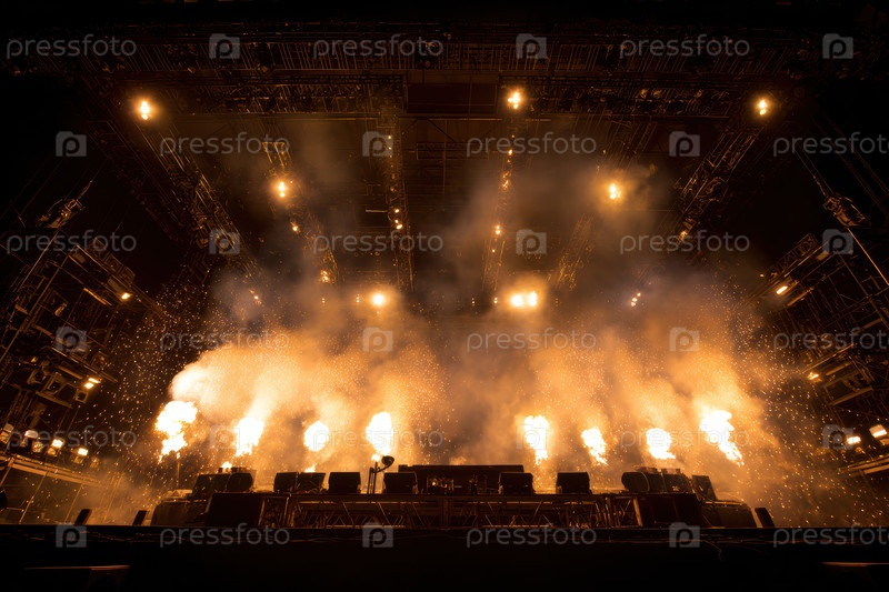 Концертная сцена пылает пиротехникой, пламя и осветительный дым окутывает платформу, ряды огненных струй синхронизированы с музыкой, возвышающиеся искры и дым