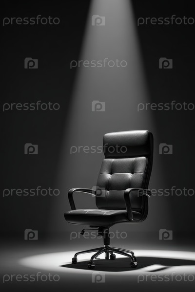 Пустой исполнительный стул под пристальным вниманием в темной студии, полированный черный кожаный поворотный стул, расположенный на круговой сцене, драматическое освещение одним лучом