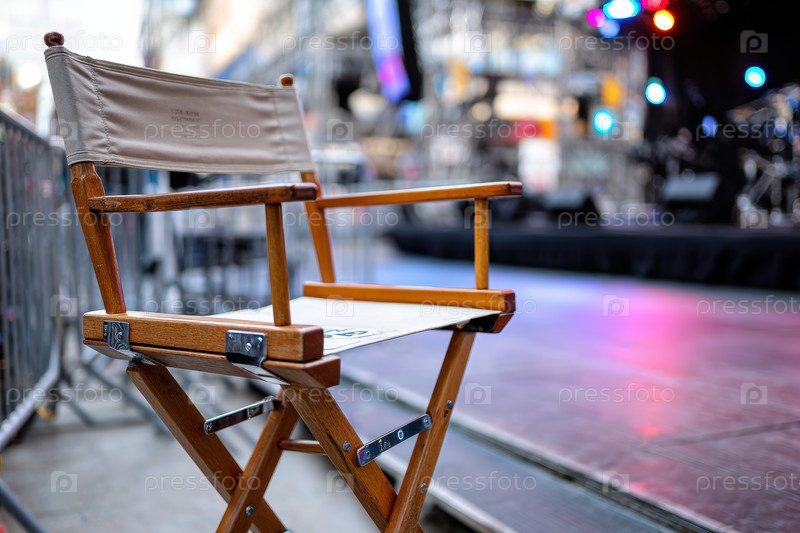 Пустое кресло режиссера под ярким прожектором на сцене, кинематографическая закулисная атмосфера с размытыми зрительными сиденьями, теплые боке, затяжное ожидание