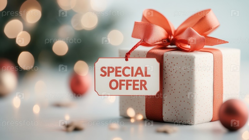Подарочная коробка с тегом специального предложения, элегантная пятнистая обертка, лук из коралловой ленты, мягкие боке и рассеянные пузырьки на нейтральной столешнице, уютный теплый отдых