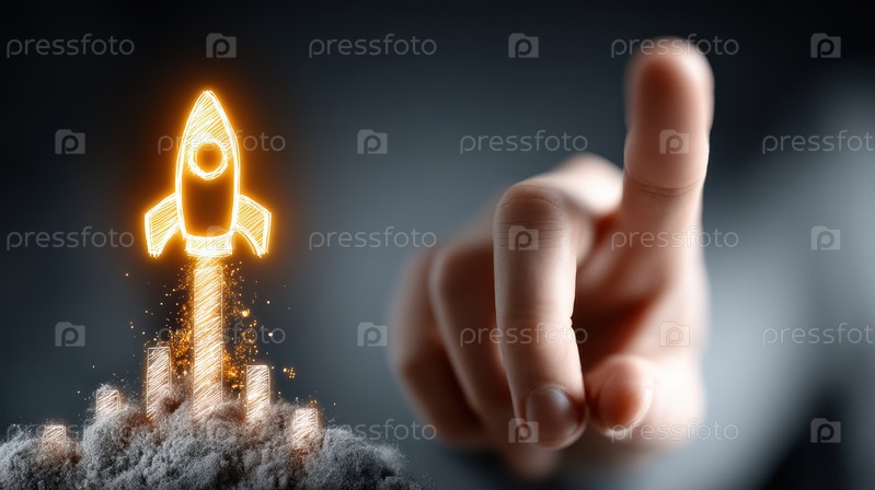 Палец, касающийся светящейся ракеты, искрится в полет над темной почвой. Близкое ручное взаимодействие с цифровой искрой, сформирован миниатюрный силуэт ракеты