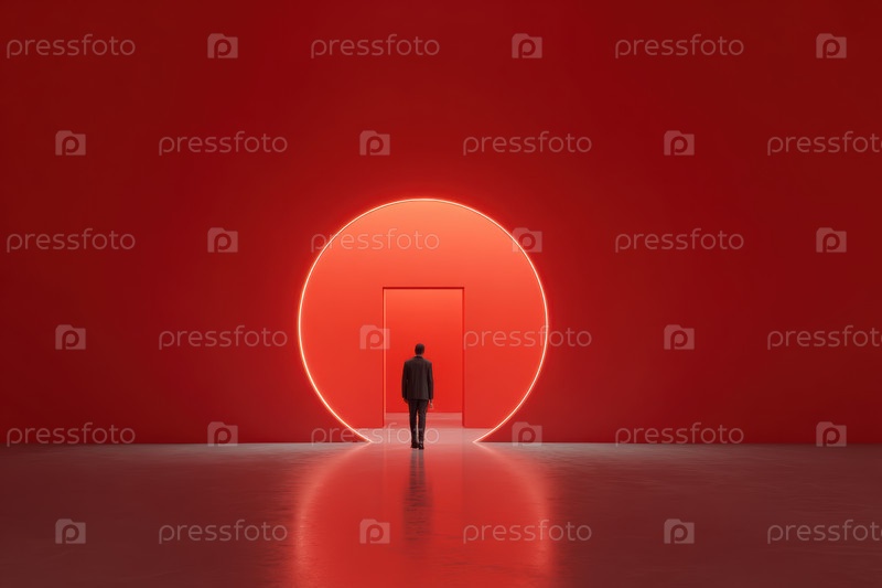 Силуэт, проходящий через светящийся красный дверной проем, одинокий путешественник, пересекающий освещенный портал в обширной темной галерее, глянцевое отражение пола, создающее драматическое