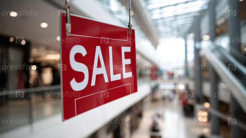Красный знак продажи, висящий в торговом центре, праздничная жестянка и круглые украшения, размытый верхний зал и стеклянный световой люк, рекламное настроение с срочными скидками