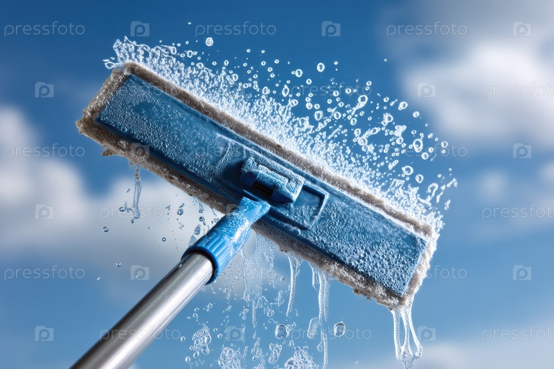 Вытирание окна с помощью брызг, подушечка из микроволокна, выпускающая капли на яркое небо; высокоскоростной захват действия по очистке стекла, движение без полосы,