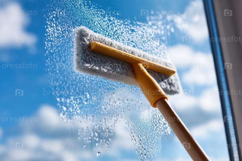 Вытирание окна с помощью брызг, подушечка из микроволокна, выпускающая капли на яркое небо; высокоскоростной захват действия по очистке стекла, движение без полосы,
