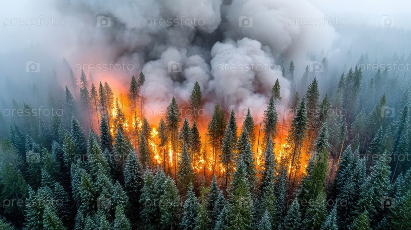 Заснеженный хвойный лес пылает дымом и пламенем, густой серый шлейф поднимается в холодное небо, огненный фронт поглощает подлесок и нижний навес, светящийся