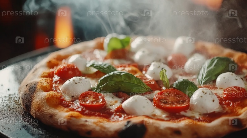 Наслаждайтесь горячей и вкусной пиццей Margherita, красиво украшенной свежим базиликом и сливочным сыром моцарелла