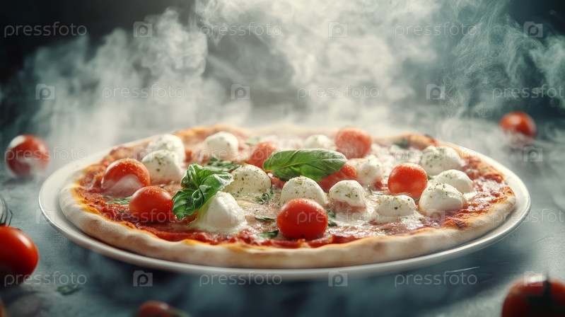 Наслаждайтесь горячей и вкусной пиццей Margherita, красиво украшенной свежим базиликом и сливочным сыром моцарелла