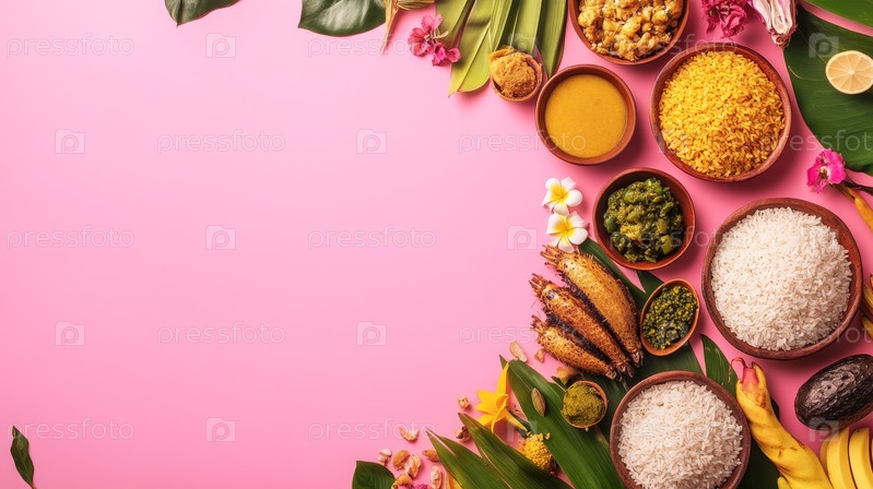 Онамская еда с рисом садхья на розовом фоне. Традиционная пищевая онасадья