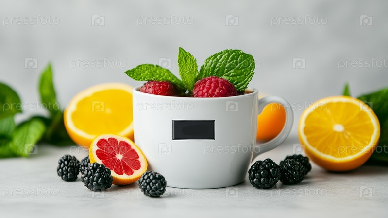 Восхитительная чашка травяного чая красиво окружена яркими, яркими оранжевыми ломтиками и множеством свежих ягод