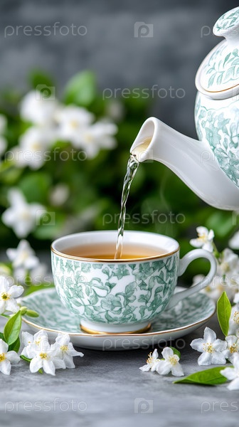 В этот безмятежный момент чай элегантно наливается в керамическую чашку, красиво обрамленную прекрасными белыми цветами