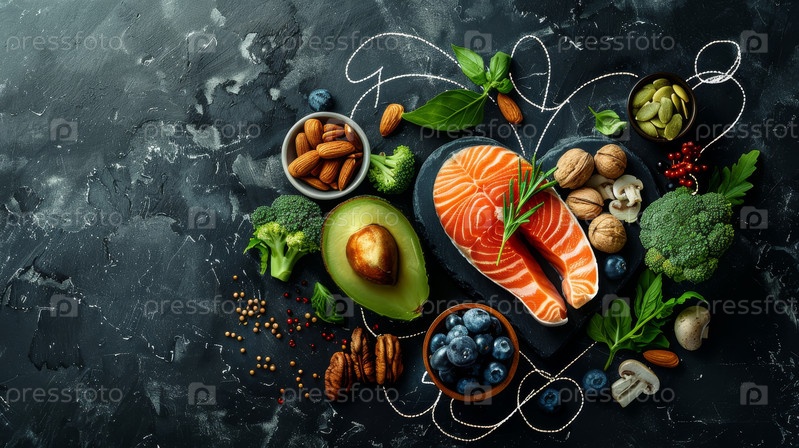 Пища для здоровья сердца: лосось, авокадо, черника, брокколи, орехи и грибы в форме сердца