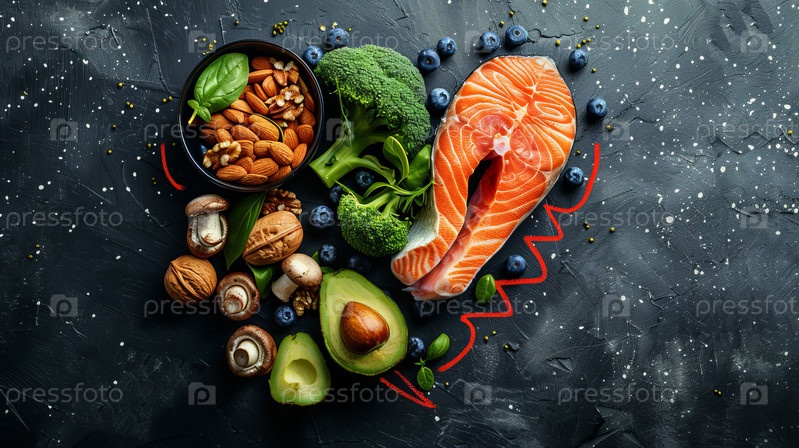 Пища для здоровья сердца: лосось, авокадо, черника, брокколи, орехи и грибы в форме сердца