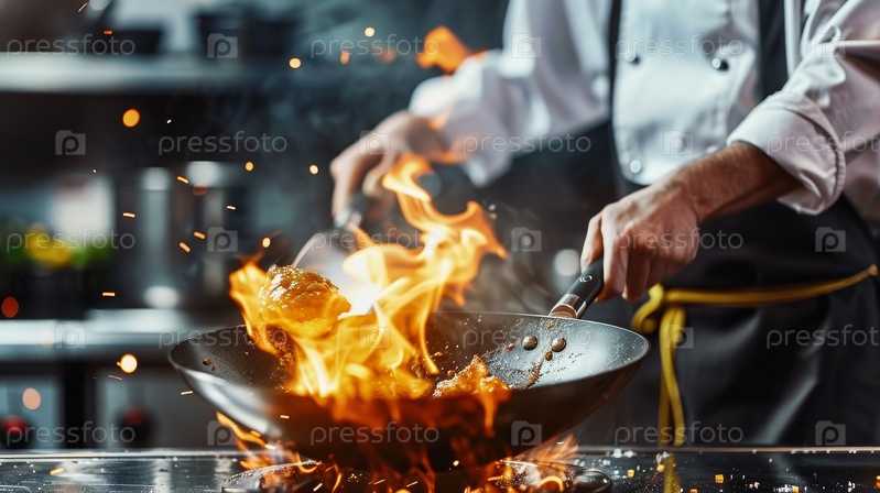 Захватывающий динамический снимок захватывает опытного шеф-повара, активно использующего огонь в яркой, высокоэнергетической кулинарной среде