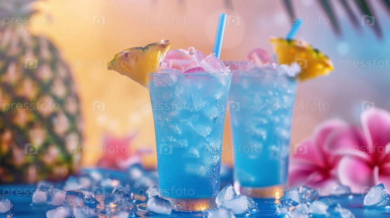 Яркие синие коктейли красиво украшены нежными цветами, прекрасно захватывая живую тропическую атмосферу