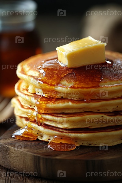 Высокая и пушистая стопка золотых блинов, увенчанных богатым расплавленным маслом и щедро засыпанных сиропом