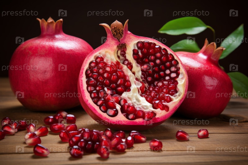 Сотрите весь гранат с разрезанными половинками и разбросанными семенами, выделяя яркий красный цвет и свежие зеленые листья