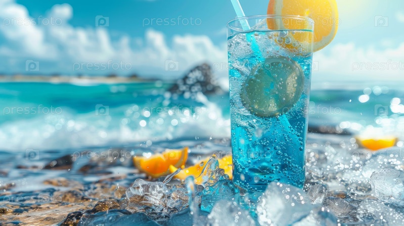 Освежающий синий коктейль с лимонным ломтиком на песчаном пляже, плещущей водой и тропическими цветами в райской обстановке