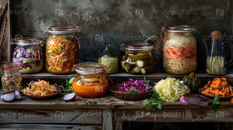 Выбор домашних ферментированных овощей в банках с квашеной капустой, кимчи и соленьями на деревенском деревянном столе
