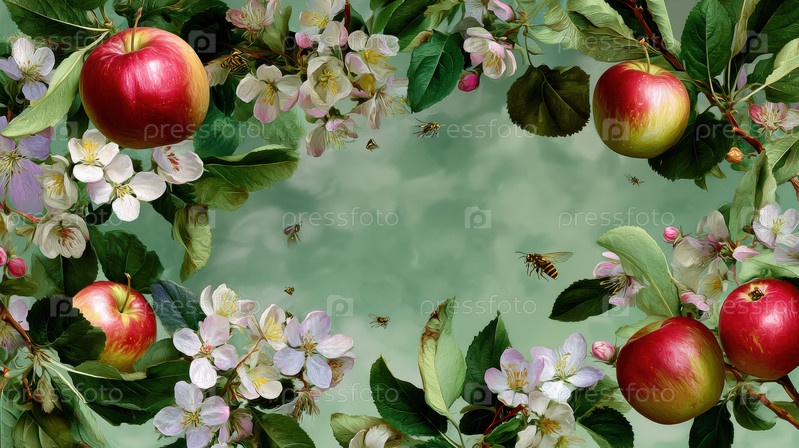 Красота сада: яркие цвета яблок и цветов на фоне пышного зеленого фона
