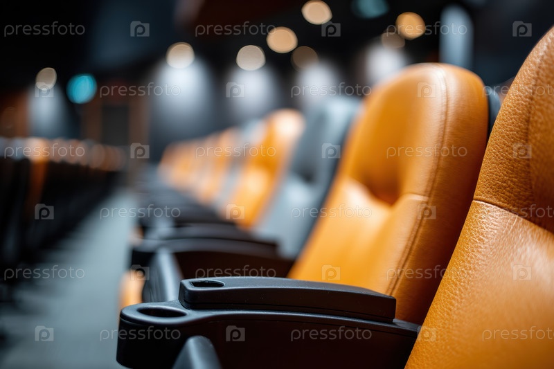 Пустые красные театральные сиденья ряд, неглубокая глубина резкости, бархатная обивка и черные подлокотники, тусклые боке огни на заднем плане, кинематографическое настроение с сфокусированным