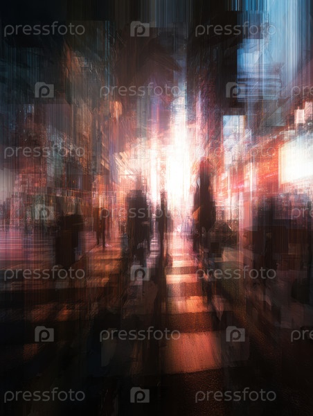 Неоновые дождливые городские уличные силуэты, движущиеся через влажные отражения и вертикальные полосы света, одинокий пассажир, спешащий мимо светящихся витрин магазинов, размытое движение