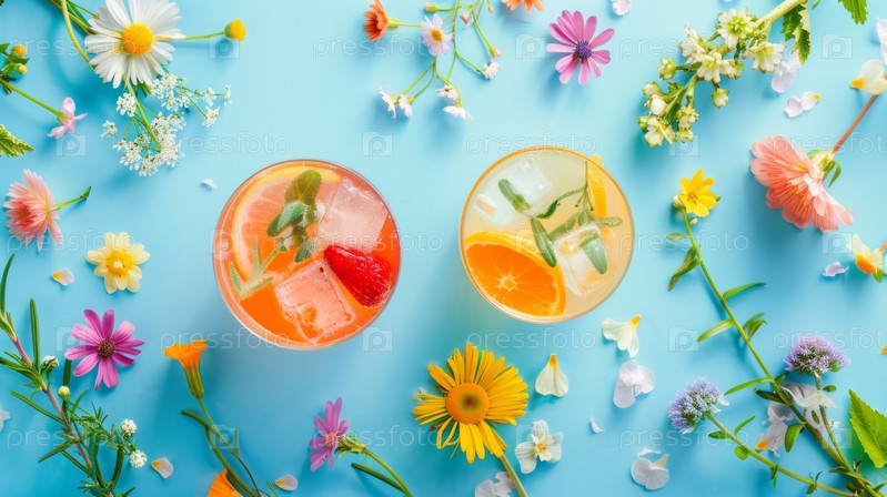 Разнообразные летние коктейли с цветами на синем освежающем фоне, показывающие освежающие напитки