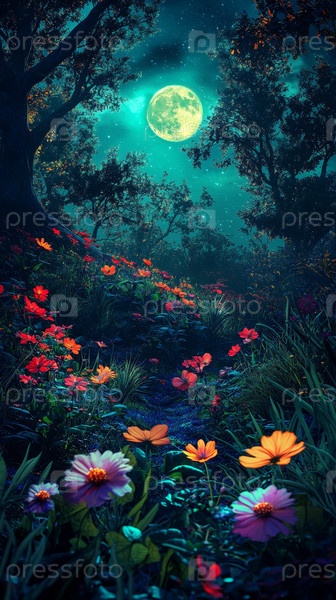 Захватывающий лесной путь с лунным светом, который имеет цветущие цветы и вокруг него есть атмосфера