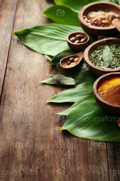 Яркие и красочные специи, приготовленные в натуральных чашах на фоне пышных тропических листьев