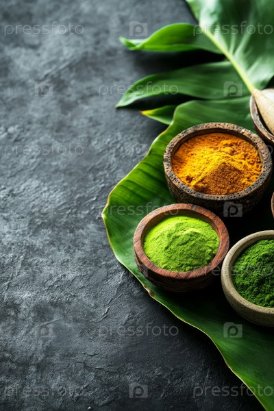 Разнообразие ярких специй, красиво расположенных в деревенских чашах на большом пышном зеленом листе для эстетической привлекательности