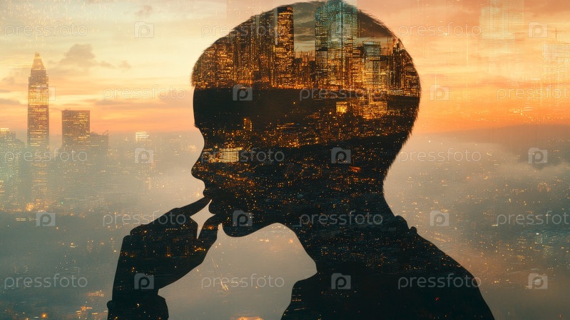 Вдумчивый и задумчивый человек смотрит на захватывающий городской пейзаж, дополненный цифровым творческим наложением