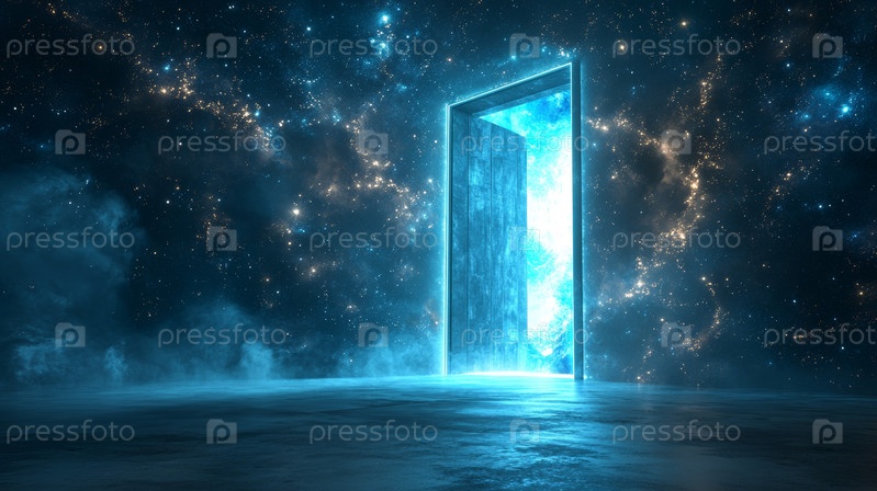 Портал Epic SciFi, окруженный излучением космической энергии и красивыми эфирными облаками в космосе