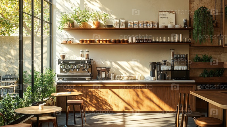 Уютный интерьер кофейни, который залит естественным светом и имеет красиво деревенские элементы декора