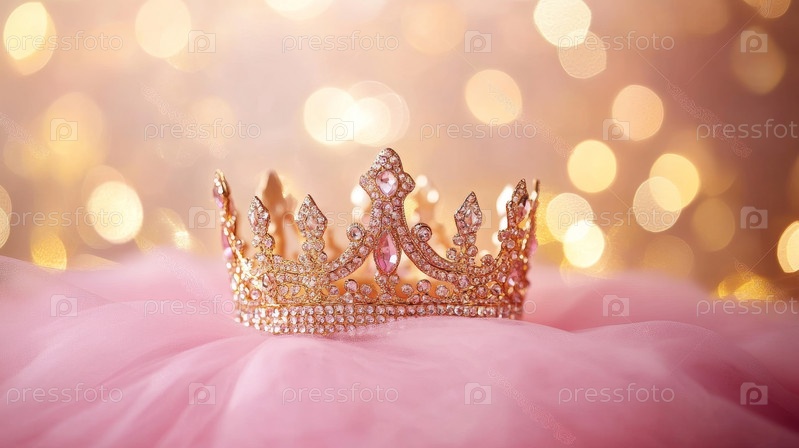 Великолепная искрометная золотая корона на фоне розового тюля, дополненная размытыми огнями