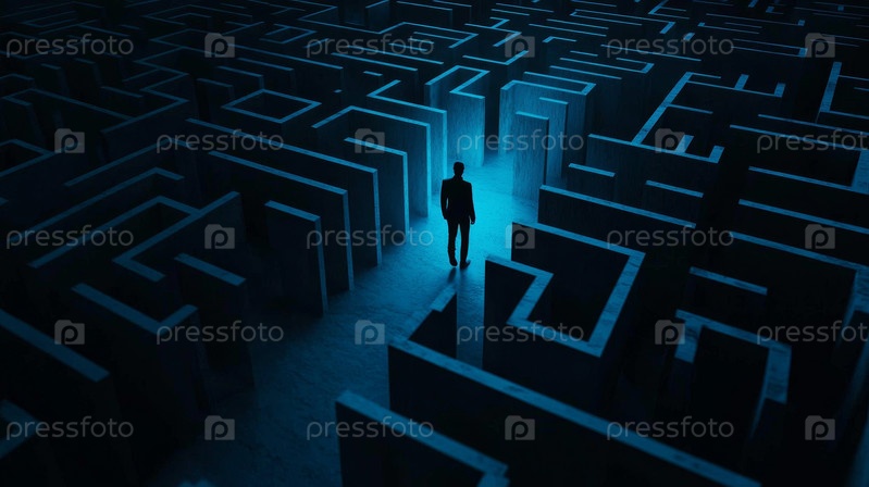 Фигура движется через красочный лабиринт, символизирующий жизненные проблемы и открытия в сюрреалистической обстановке