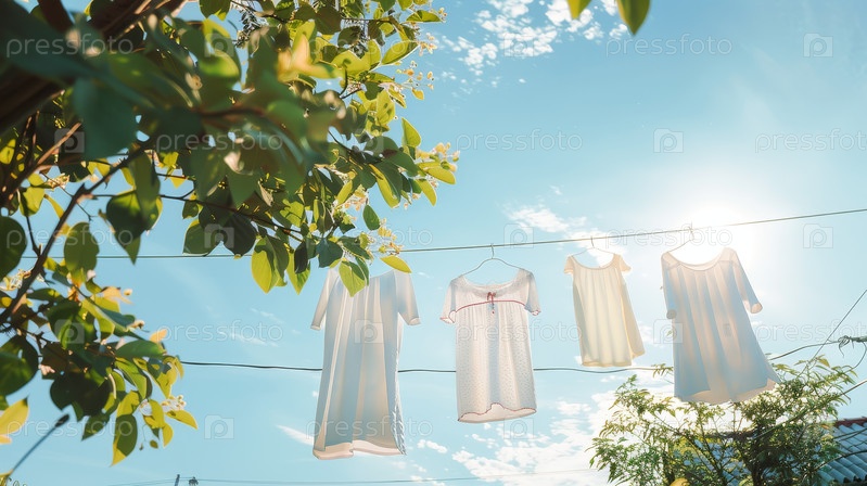 Залитая солнцем белая прачечная, висящая на линии, задний двор выветрившегося коттеджа, мягкий бриз, поднимающий постельное белье, тени из орчарда, теплый летний день, домохозяйка