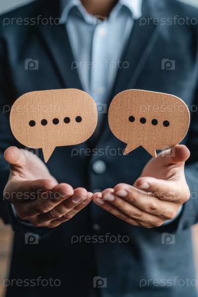 Бизнесмен, одетый в костюм, участвует в диалоге и общении, представленном речевыми пузырями над ним